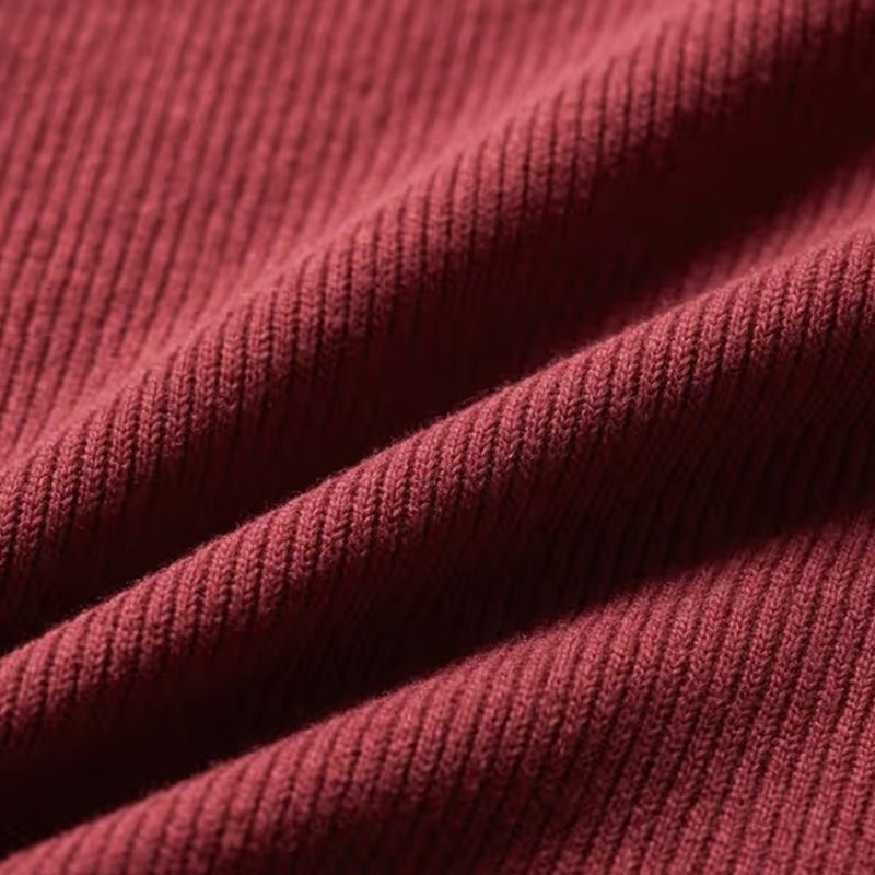 1*1 골지 벨벳 원단(Ribbed Velvet Fabric)은 1바늘 업 1바늘 다운 직조 공정을 사용하여 표면을 파인 벨벳(fine Velvet)으로 덮어 보온성이 우수하고 부드러운 촉감을 지닌 원단입니다. 골지 직조 구조로 원단의 신축성이 뛰어나며 피부에 밀착되어 편안한 착용감을 제공하며 특히 추운 계절에 사용하기에 적합합니다. 원단의 벨벳 표면은 부드럽고 섬세할 뿐만 아니라 편안함을 높여주며, 보온성을 효과적으로 가두어주고 찬 공기가 들어오는 것을 막아줍니다. 이 원단은 보온성이 뛰어나 겨울 의류, 특히 스웨터 칼라와 레깅스 허리밴드에 적합하여 이러한 부분에 추가적인 보온성과 지지력을 제공합니다. 1*1 골지 디자인으로 원단의 신축성을 높여 원단의 신축이 자유롭게 되어 착용시 핏과 편안함을 보장합니다.